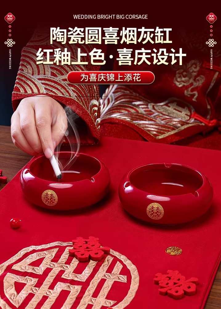 陶瓷结婚红色烟灰缸婚礼喜字防飞灰烟缸创意家用客厅婚庆